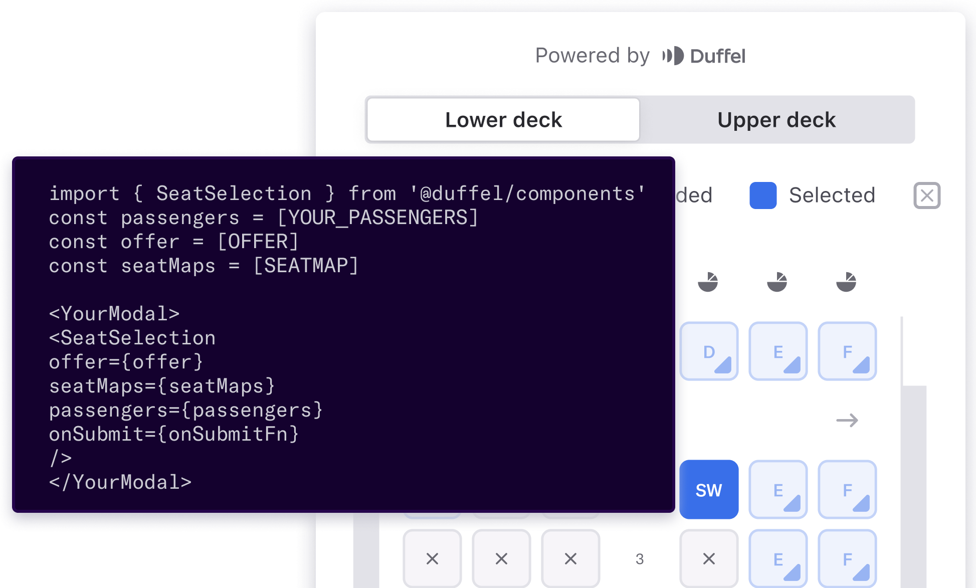 Our JavaScript component can be dropped into any website and integrates seamlessly with the Duffel Flights API – all you need to do is include the component on your site and pass in the data you get from the API. Now your customers can select their desired seats for all the flights and people travelling in their booking.