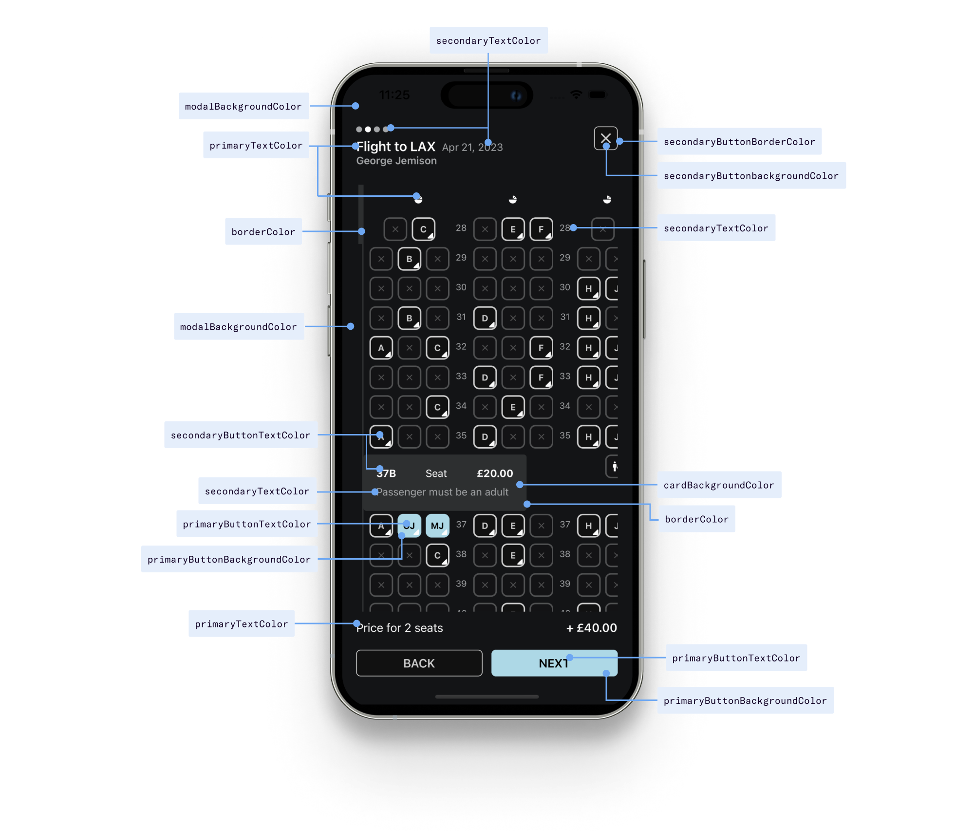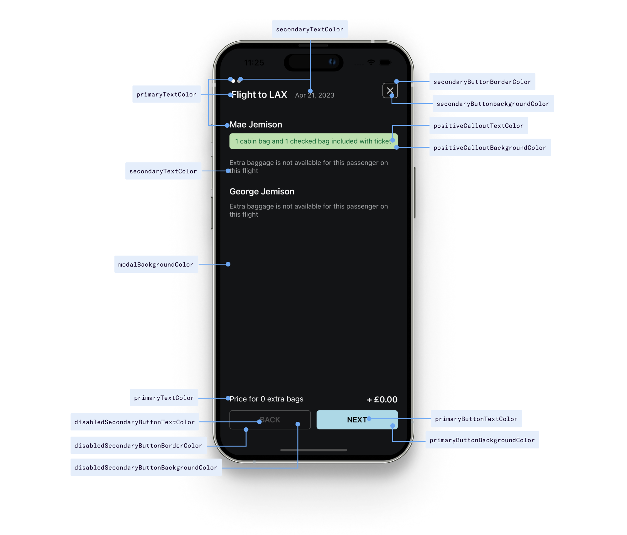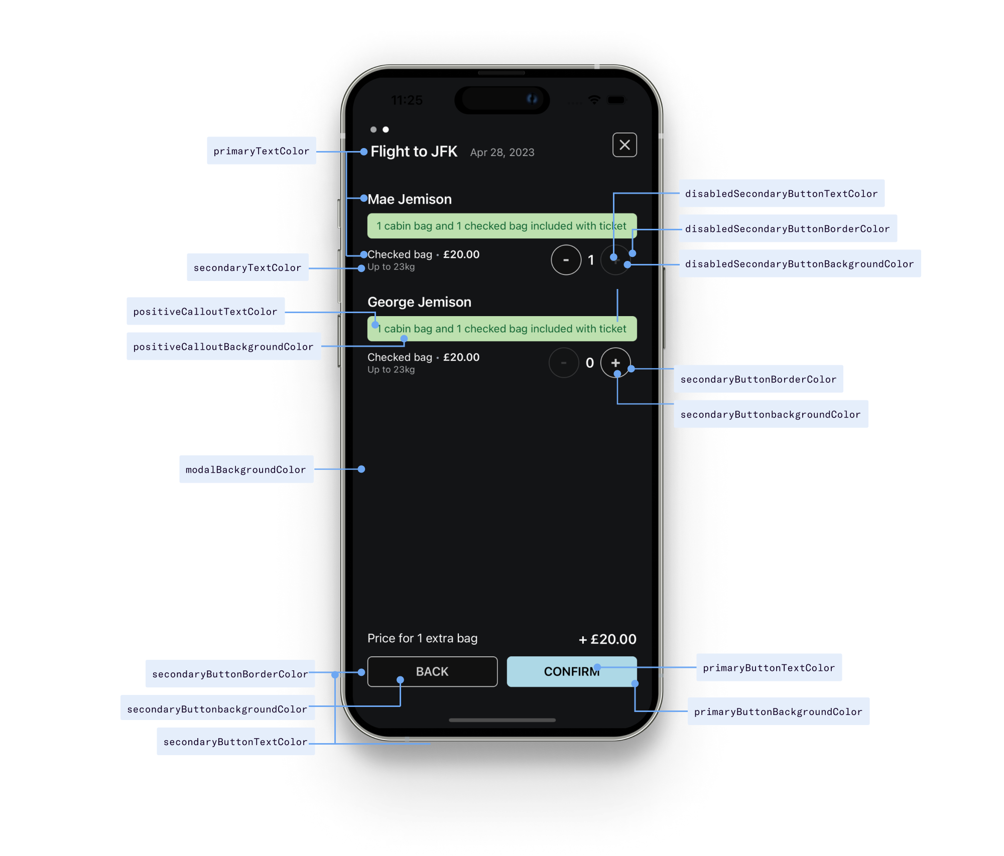 <DuffelAncillaries...theme={{primaryTextColor: '#FBFBFB',secondaryTextColor: '#A4A6A8',borderColor: '#2D2F30',modalBackgroundColor: '#131416',cardBackgroundColor: '#2D2F30',tooltipBackgroundColor: '#2D2F30',primaryButtonTextColor: 'black',primaryButtonBackgroundColor: 'lightblue',secondaryButtonTextColor: '#ccc',secondaryButtonBackgroundColor: '#111',secondaryButtonBorderColor: '#ccc',disabledSecondaryButtonTextColor: '#cccccc55',disabledSecondaryButtonBackgroundColor: '#11111155',disabledSecondaryButtonBorderColor: '#cccccc55',positiveCalloutTextColor: '#106331',positiveCalloutBackgroundColor: '#bde0af',}}/>